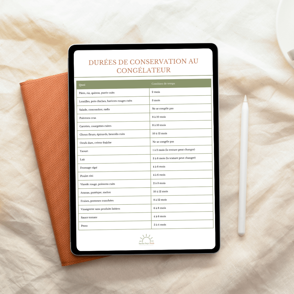 Combien de temps garder tes aliments au congélateur ? Légumes, viandes, féculents, sauces : le guide complet avec un mémo à télécharger et imprimer pour ta cuisine.